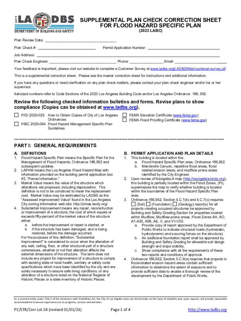 SUPPLEMENTAL PLAN CHECK CORRECTION SHEET FOR FLOOD HAZARD SPECIFIC PLAN (2023 LAB)Plan Review Date: ___ Plan Check #:Permit Application Number:Job Address: Plan Check Engineer: ___ Phone: ___ Email: