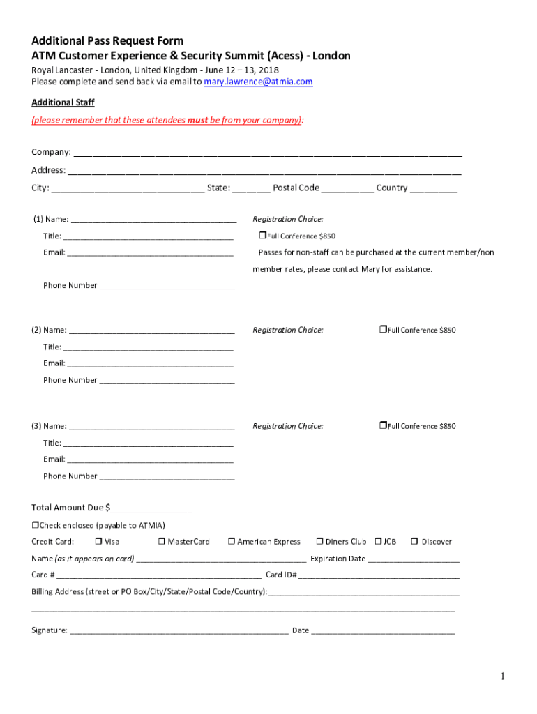 Additional Pass Request Form ATM Customer Experience & Security Summit (Access) London Royal Lancaster London, United Kingdom June 12 13, 2018 Please complete and send back via email to mary.lawrence@atmia.com