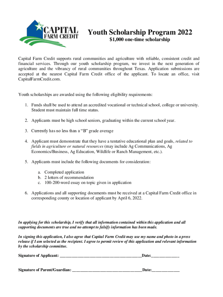 Youth Scholarship Program $20221,000 onetime scholarshipCapital Farm Credit supports rural communities and agriculture with reliable, consistent credit and financial services. Through our youth scholarship