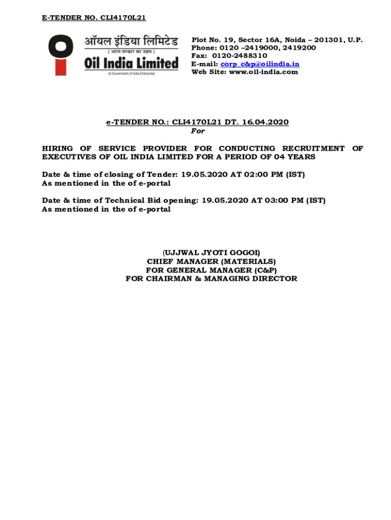 Get the free e-TENDER NO.: CLI4170L21 DT. 16.04.2020 - Oil India Limited
