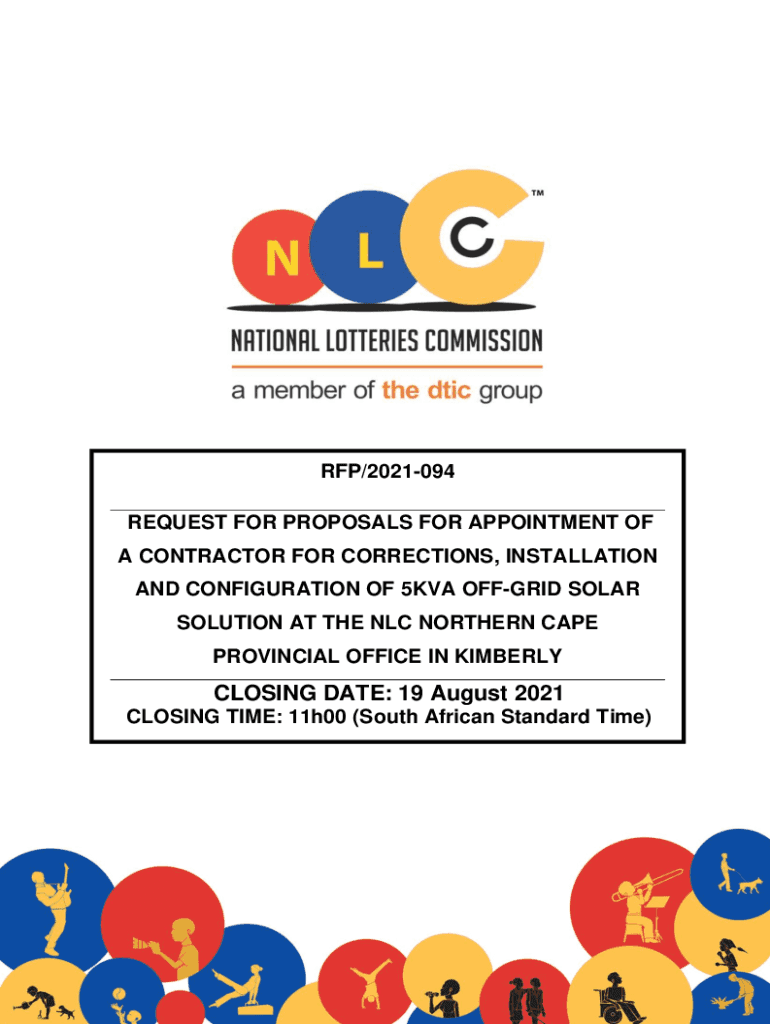 RFP/2021094 REQUEST FOR PROPOSALS FOR APPOINTMENT OF A CONTRACTOR FOR CORRECTIONS, INSTALLATION AND CONFIGURATION OF 5KVA OFF GRID SOLAR SOLUTION AT THE NFC NORTHERN CAPE PROVINCIAL OFFICE IN KIMBERLYCLOSING