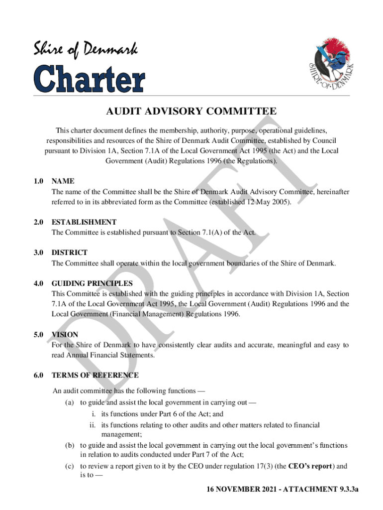 Shire of DenmarkAUDIT ADVISORY COMMITTEE This charter document defines the membership, authority, purpose, operational guidelines, responsibilities and resources of the Shire of Denmark Audit Committee,