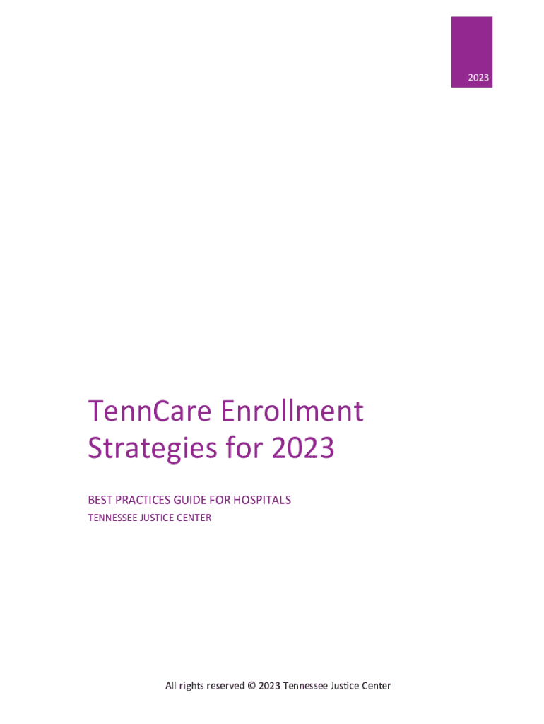 2023TennCare Enrollment Strategies for 2023 BEST PRACTICES GUIDE FOR HOSPITALS TENNESSEE JUSTICE Central rights reserved 2023 Tennessee Justice Contestable of Contents Introduction and Special Acknowledgement.......................................................................................