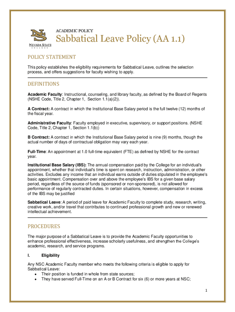 Get the free Sabbatical Leave Policy (AA 1.1) - Nevada State College
