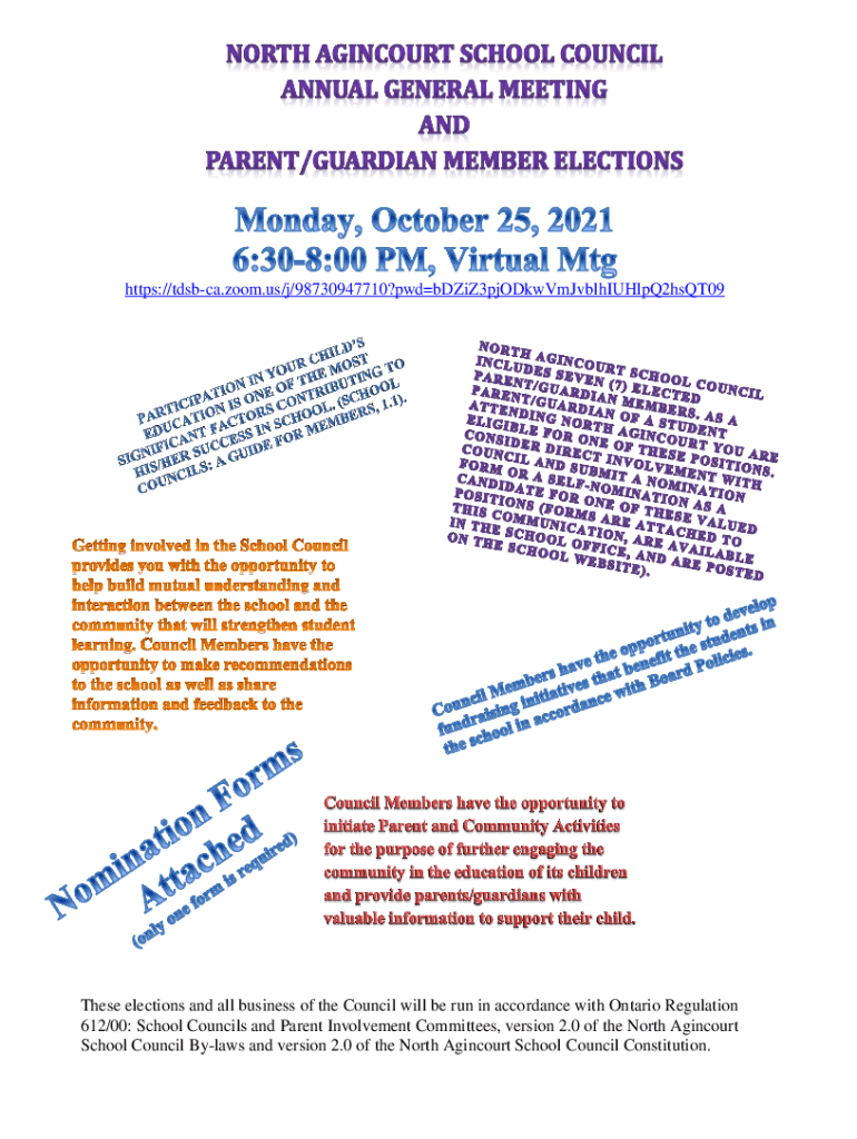 HTTPS://tdsbca.zoom.us/j/98730947710?pwdbDZiZ3pjODkwVmJvblhIUHlpQ2hsQT09These elections and all business of the Council will be run in accordance with Ontario Regulation 612/00: School Councils and