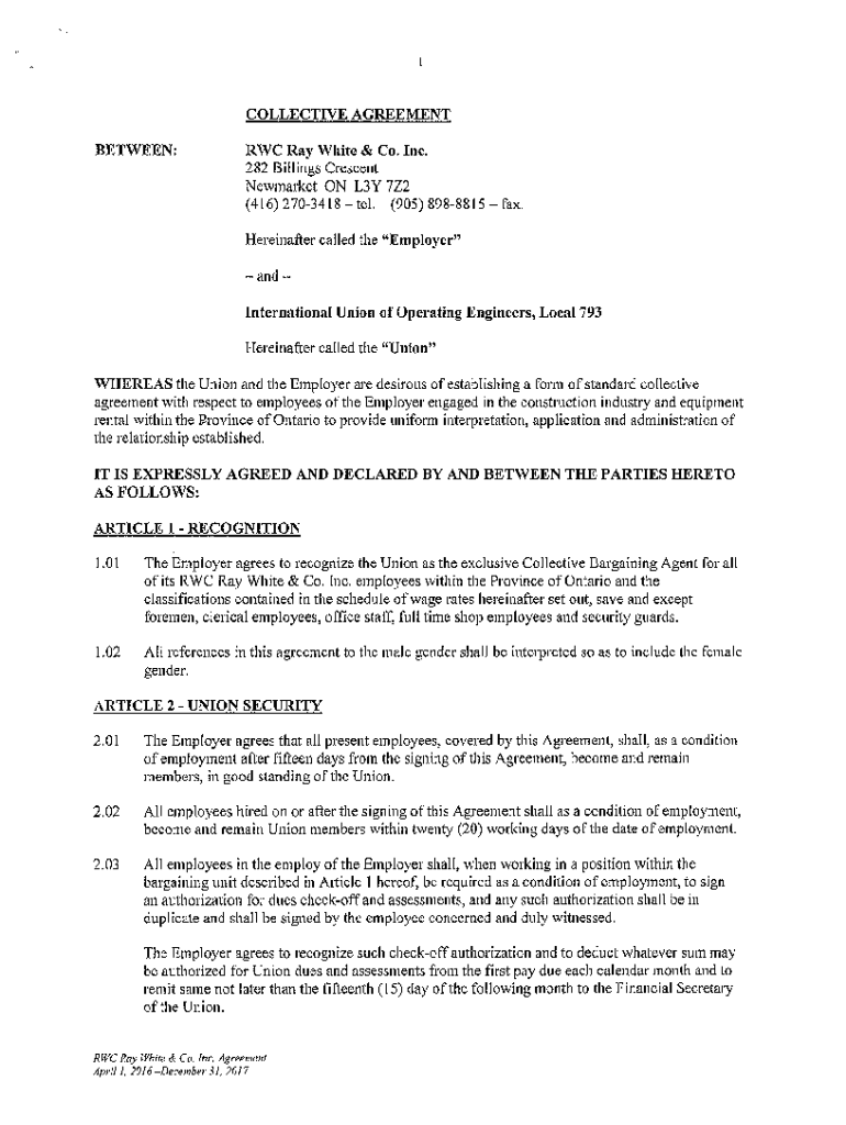 COLLECTIVE AGREEMENT BETWEEN:ROC Ray White & Co. Inc. 282 Billings Crescent Newmarket ON L3Y 722 (416) 2703418 tel. (905) 8988815 fax. Hereinafter called the \” Employer\” international Union