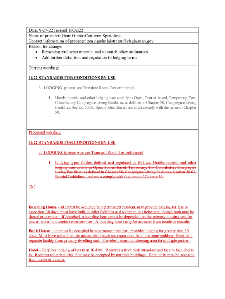 Date: 92722 revised 18Oct22 Name of preparer: Gene Garage/Cameron Spend love Contact information of preparer: zoningadministrator@virgin.utah.gov Reason for change: Removing irrelevant material and