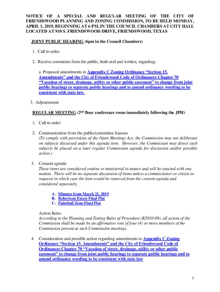 NOTICE OF A SPECIAL AND REGULAR MEETING OF THE CITY OF FRIENDSWOOD PLANNING AND ZONING COMMISSION, TO BE HELD MONDAY, APRIL 1, 2019, BEGINNING AT 6 PM, IN THE COUNCIL CHAMBERS AT CITY HALL LOCATED