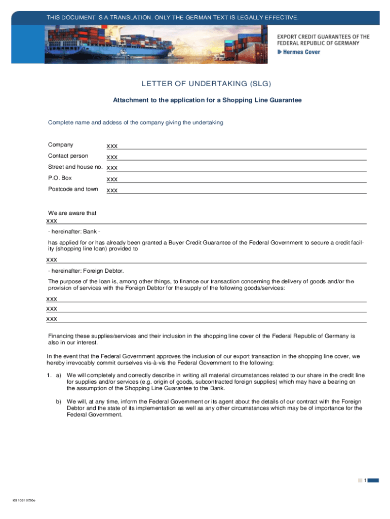 THIS DOCUMENT IS A TRANSLATION. ONLY THE GERMAN TEXT IS LEGALLY EFFECTIVE.LETTER OF UNDERTAKING (SLG) Attachment to the application for a Shopping Line GuaranteeComplete name and address of the company