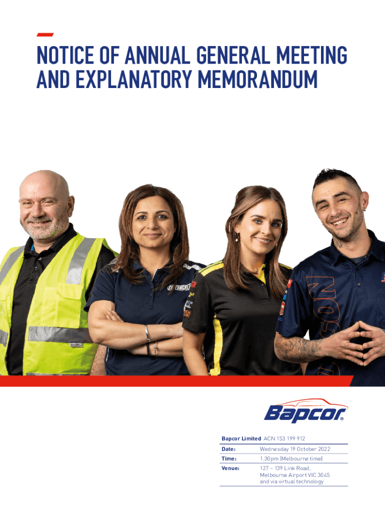NOTICE OF ANNUAL GENERAL MEETING AND EXPLANATORY MEMORANDUMBapcor Limited ACN 153 199 912 Date:Wednesday 19 October 2022Time:1.30pm (Melbourne time)Venue:127 139 Link Road, Melbourne Airport VIC 3045