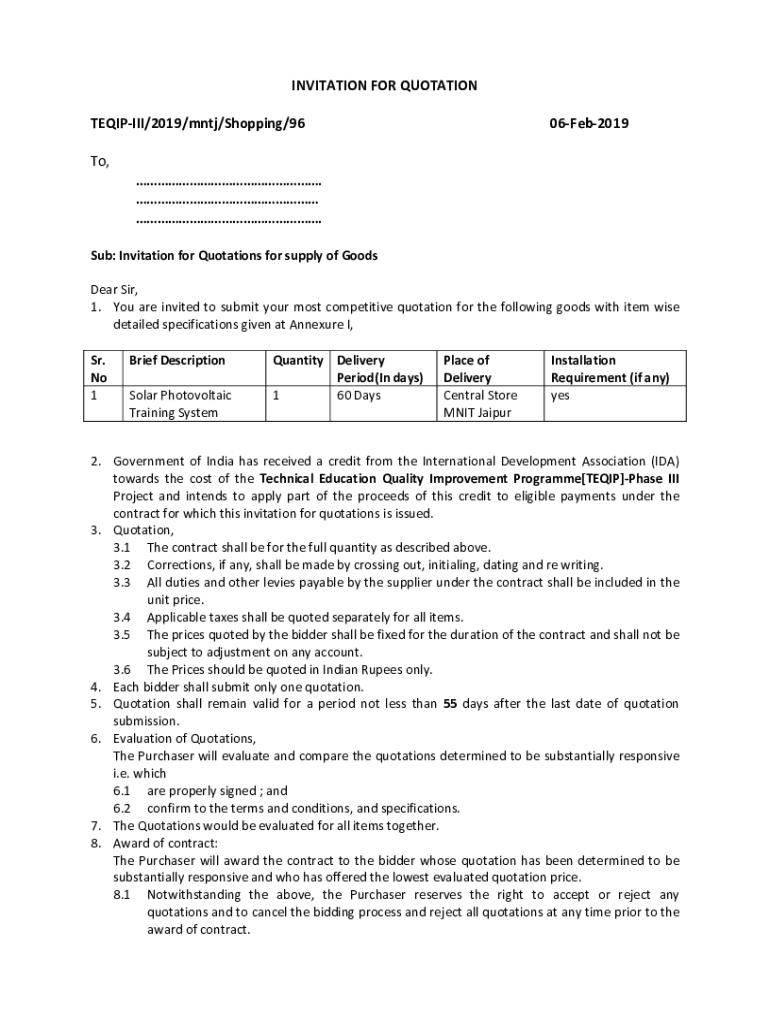INVITATION FOR QUOTATION TEQIPIII/2019/MNT/Shopping/9606Feb2019To, Sub: Invitation for Quotations for supply of Goods Dear Sir, 1. You are invited to submit your most competitive quotation for the