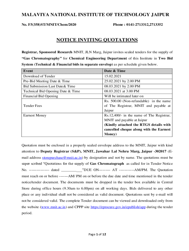 MALARIA NATIONAL INSTITUTE OF TECHNOLOGY JAIPUR No. F5(358)ST/UNIT/Chem/2020Phone : 01412713312,2713352NOTICE INVITING QUOTATIONS Registrar, Sponsored Research UNIT, JON Mary, Jaipur invites sealed