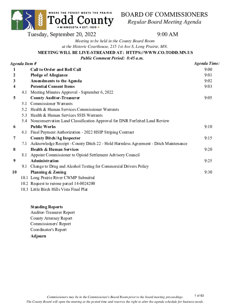 BOARD OF COMMISSIONERS Regular Board Meeting Agenda Tuesday, September 20, 20229:00 Meeting to be held in the County Board Room at the Historic Courthouse, 215 1st Ave S, Long Prairie, MN. MEETING