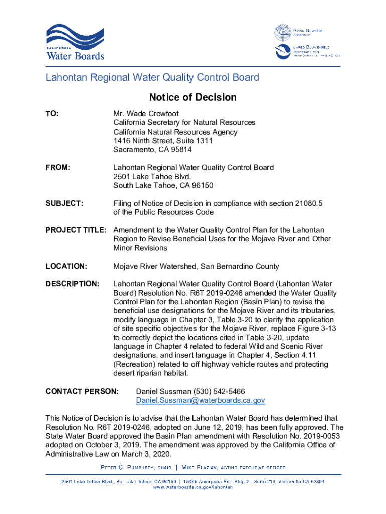 Lankan Regional Water Quality Control Board Notice of Decision TO:Mr. Wade Crowfoot California Secretary for Natural Resources California Natural Resources Agency 1416 Ninth Street, Suite 1311 Sacramento,