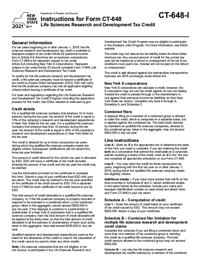 Department of Taxation and FinanceInstructions for Form CT648CT648ILife Sciences Research and Development Tax Credit General information tax years beginning on or after January 1, 2018, the life sciences