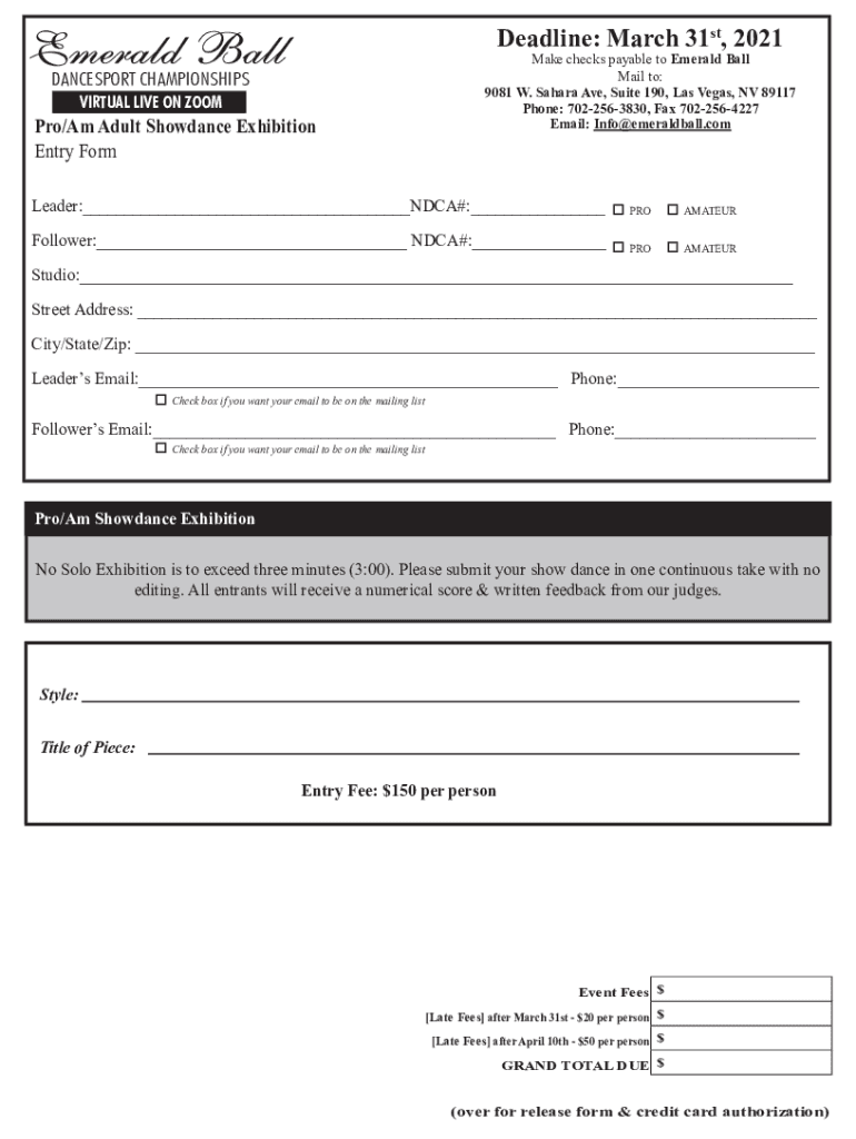 Deadline: March 31st, 2021DANCESPORT CHAMPIONSHIPS VIRTUAL LIVE ON Zoom/Am Adult Show dance Exhibition Entry Forsake checks payable to Emerald Ball Mail to: 9081 W. Sahara Ave, Suite 190, Las Vegas,