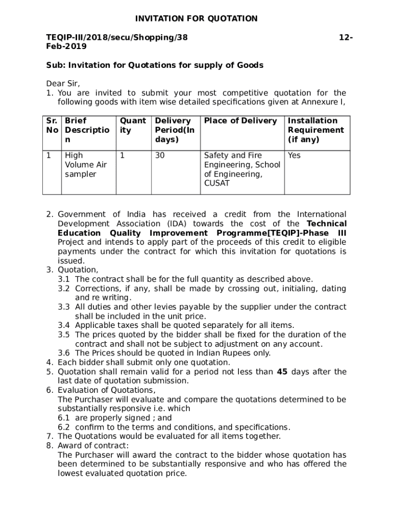 INVITATION FOR QUOTATION TEQIPIII/2018/sect/Shopping/38 Feb201912Sub: Invitation for Quotations for supply of Goods Dear Sir, 1. You are invited to submit your most competitive quotation for the following