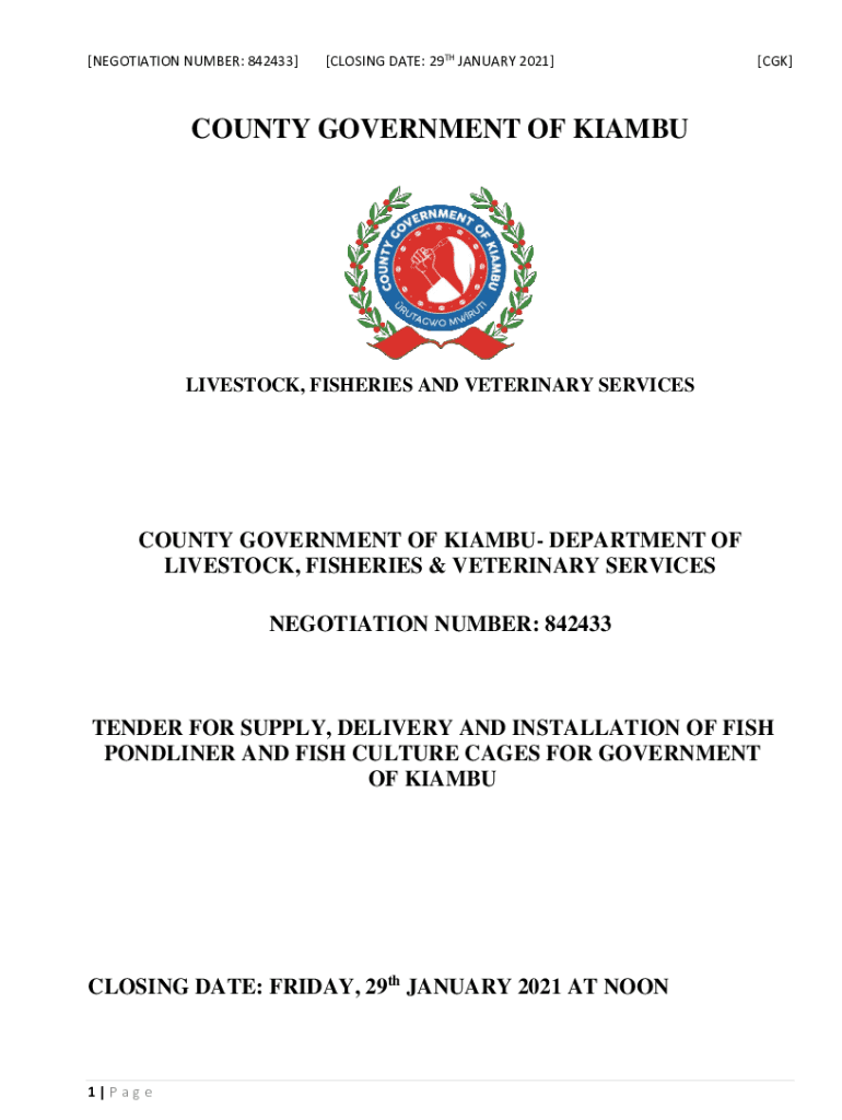 [NEGOTIATION NUMBER: 842433][CLOSING DATE: 29TH JANUARY 2021][CGK]COUNTY GOVERNMENT OF KIAMBULIVESTOCK, FISHERIES AND VETERINARY SERVICESCOUNTY GOVERNMENT OF IAMB DEPARTMENT OF LIVESTOCK, FISHERIES