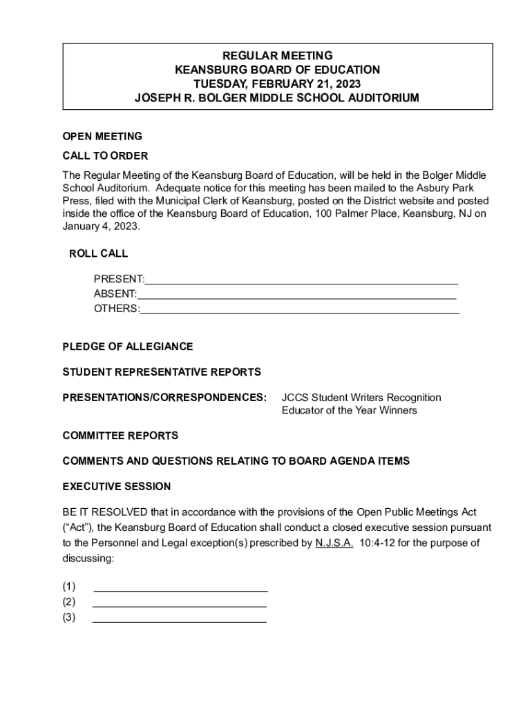 REGULAR MEETING GINSBURG BOARD OF EDUCATION TUESDAY, FEBRUARY 21, 2023, JOSEPH R. BOLDER MIDDLE SCHOOL AUDITORIUM OPEN MEETING CALL TO ORDER The Regular Meeting of the Ginsburg Board of Education,