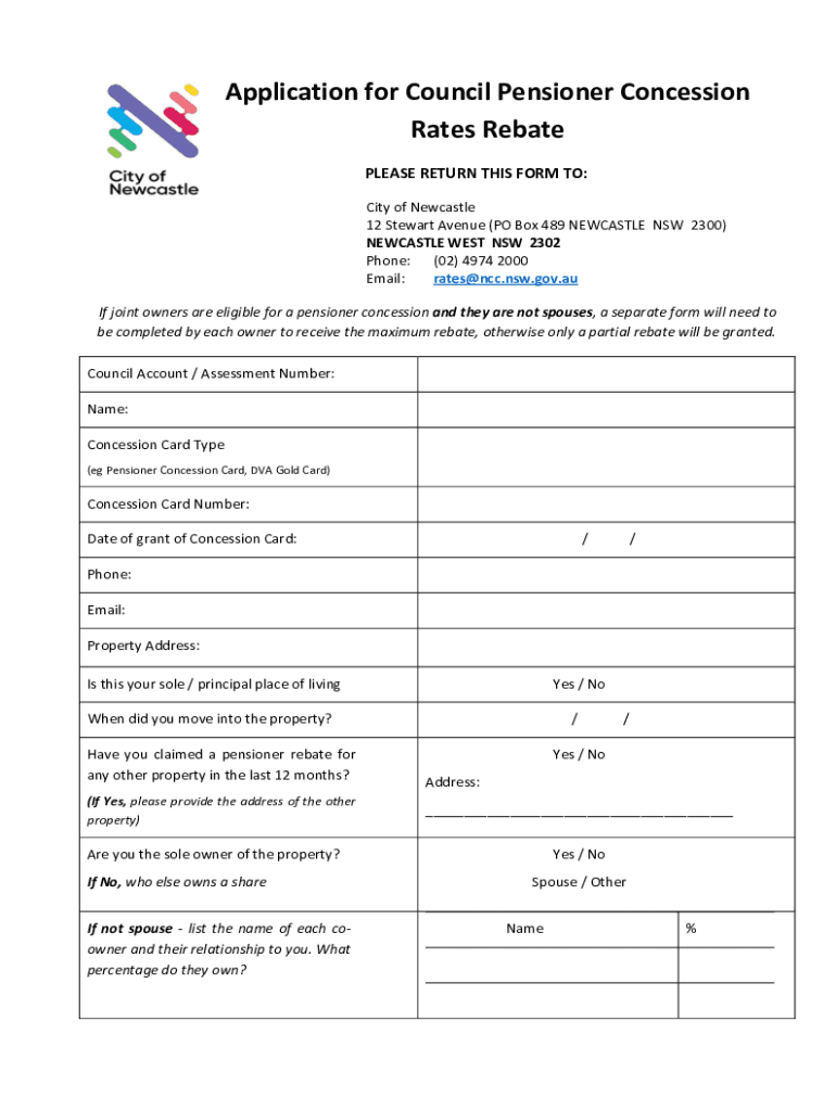 Application for Council Pensioner Concession Rates Rebate PLEASE RETURN THIS FORM TO: City of Newcastle 12 Stewart Avenue (PO Box 489 NEWCASTLE NSW 2300) NEWCASTLE WEST NSW 2302 Phone: (02) 4974 2000
