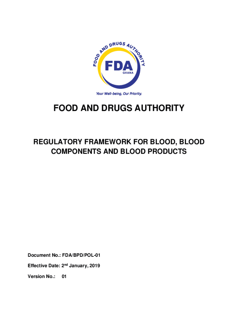 FOOD AND DRUGS AUTHORITYREGULATORY FRAMEWORK FOR BLOOD, BLOOD COMPONENTS AND BLOOD PRODUCTSDocument No.: FDA/BPD/POL01 Effective Date: 2nd January 2019 Version No.:01BACKGROUND The legislative basis
