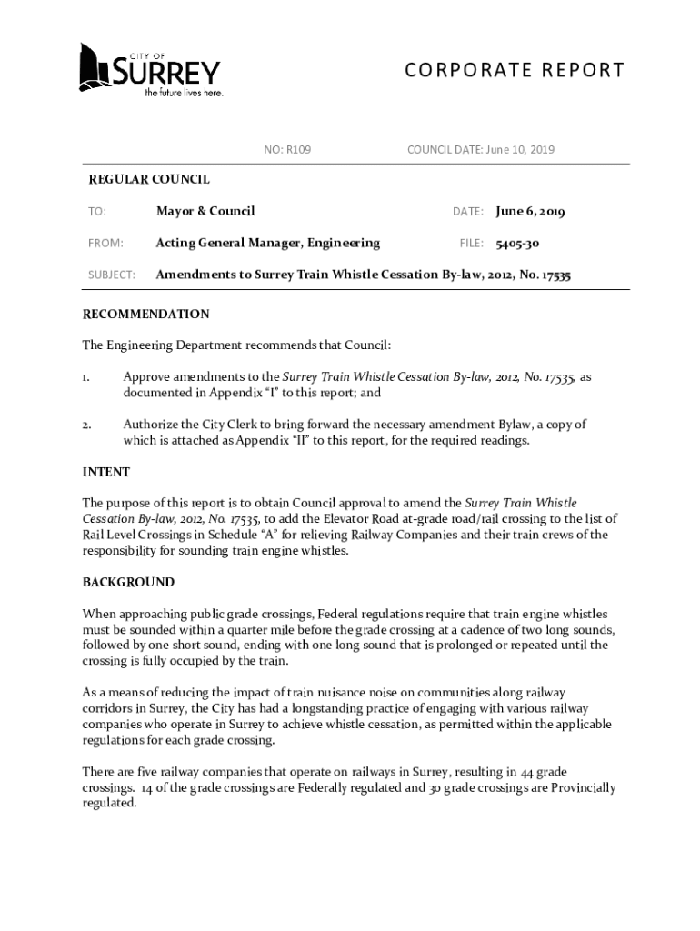 CORPORATE REPORT NO: R109COUNCIL DATE: June 10, 2019REGULAR COUNCIL TO:Mayor & Conciliate: June 6, 2019FROM:Acting General Manager, EngineeringSUBJECT:Amendments to Surrey Train Whistle Cessation
