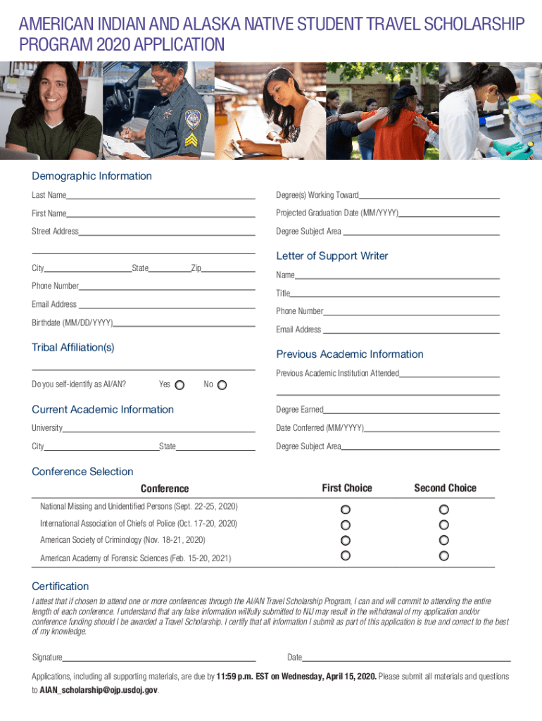 AMERICAN INDIAN AND ALASKA NATIVE STUDENT TRAVEL SCHOLARSHIP PROGRAM 2020 APPLICATIONDemographic Information Last Nondegree(s) Working TowardFirst NameProjected Graduation Date (MM/YYY)Street AddressDegree