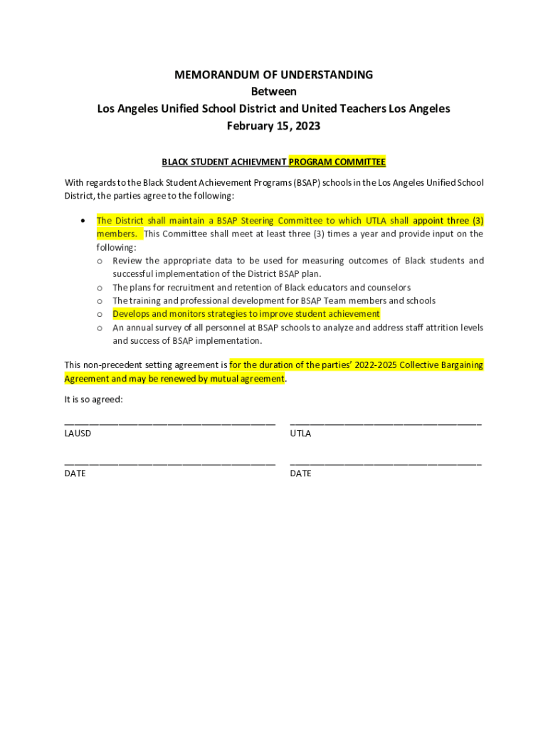MEMORANDUM OF UNDERSTANDING Between Los Angeles Unified School District and United Teachers Los Angeles February 15, 2023, BLACK STUDENT ACHIEVEMENT PROGRAM COMMITTEE In regard to the Black Student