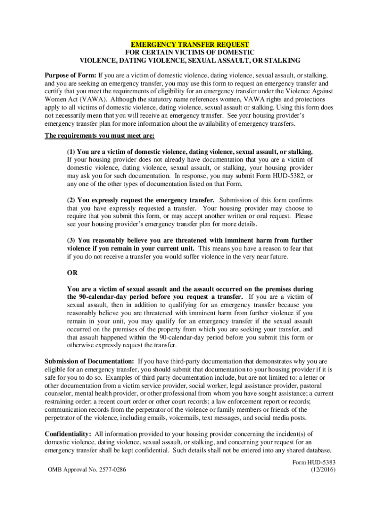 EMERGENCY TRANSFER REQUEST FOR CERTAIN VICTIMS OF DOMESTIC VIOLENCE, DATING VIOLENCE, SEXUAL ASSAULT, OR STALKING Purpose of Form: If you are a victim of domestic violence, dating violence, sexual