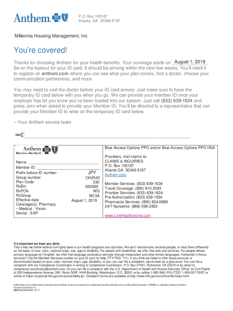 P.O. Box 105187 Atlanta, GA 303485187Millennia Housing Management, Inc. You're covered! August 1, 2019, Thanks for choosing Anthem for your health benefits. Your coverage starts on ___. Be on the