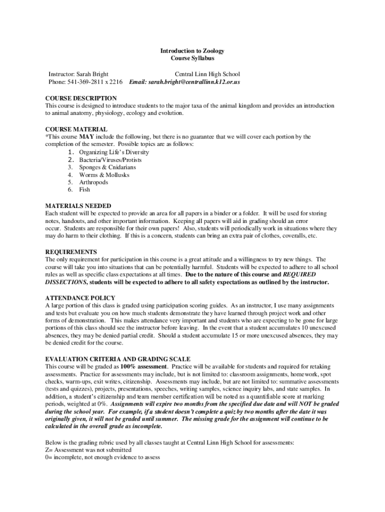Introduction to Zoology Course Syllabus Instructor: Sarah Bright Phone: 5413692811 x 2216Central Line High School Email: sarah.bright@centrallinn.k12.or.usCOURSE DESCRIPTION This course is designed