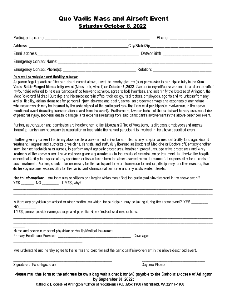Quo Wadis Mass and Airsoft Event Saturday, October 8, 2022, Participants name:___Phone: ___Address: ___City/State/Zip___ Email address:___ Date of Birth: ___ Emergency Contact Name: ___ Emergency