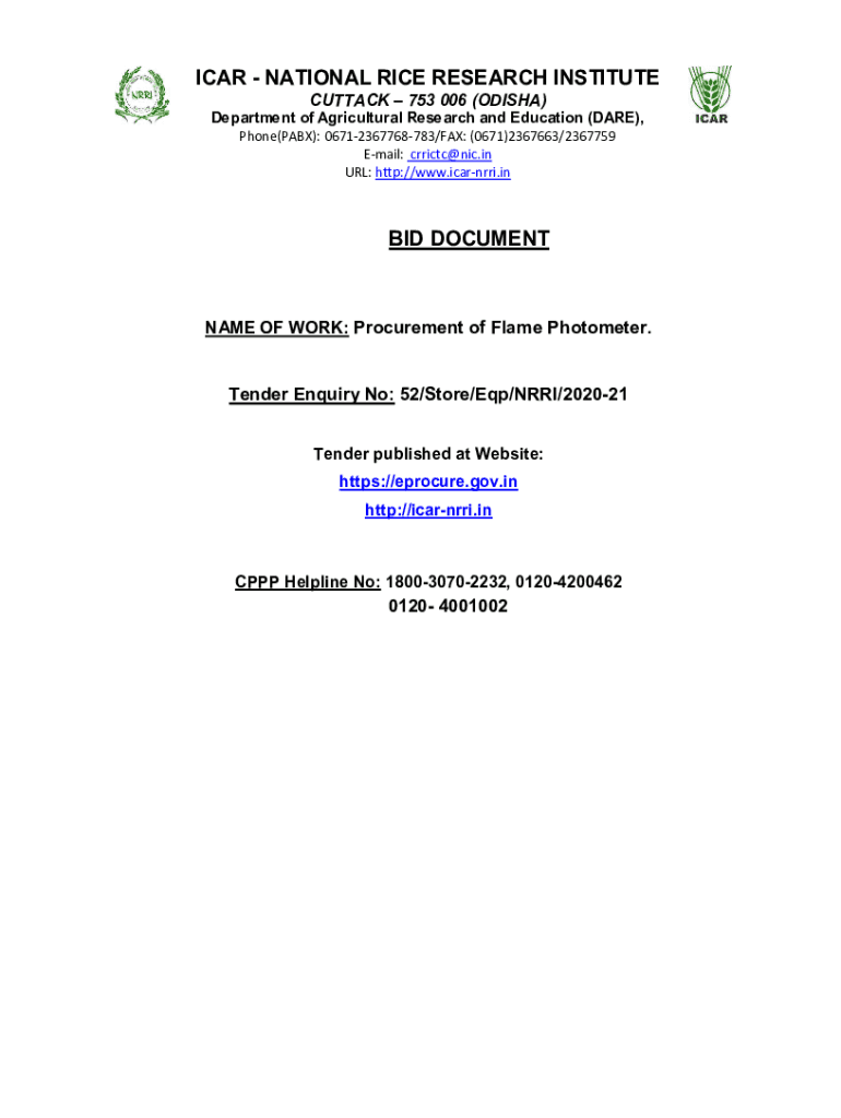 CAR NATIONAL RICE RESEARCH INSTITUTE CUTTACK 753 006 (ODISHA)Department of Agricultural Research and Education (DARE), Phone(PBX): 06712367768783/FAX: (0671)2367663/2367759 Email: crrictc@nic.in URL: