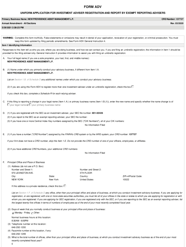 FORM ADV UNIFORM APPLICATION FOR INVESTMENT ADVISER REGISTRATION AND REPORT BY EXEMPT REPORTING ADVISERS Primary Business Name: NEW PROVIDENCE ASSET MANAGEMENT L.P.CRD Number: 137727Annual Amendment