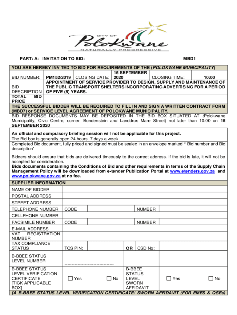 PART: A: INVITATION TO BID:MBD1YOU ARE HEREBY INVITED TO BID FOR REQUIREMENTS OF THE (COOKWARE MUNICIPALITY) 15 SEPTEMBER 10:00 BID NUMBER: PM152/2019 CLOSING DATE: 2020 CLOSING TIME: APPOINTMENT