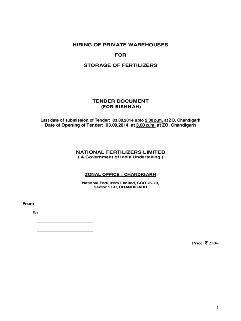 HIRING OF PRIVATE WAREHOUSES FOR STORAGE OF FERTILIZERSTENDER DOCUMENT (FOR MISHNAH)Last date of submission of Tender: 03.09.2014 unto 2.30 p.m. at ZO, ChandigarhDate of Opening of Tender: 03.09.2014