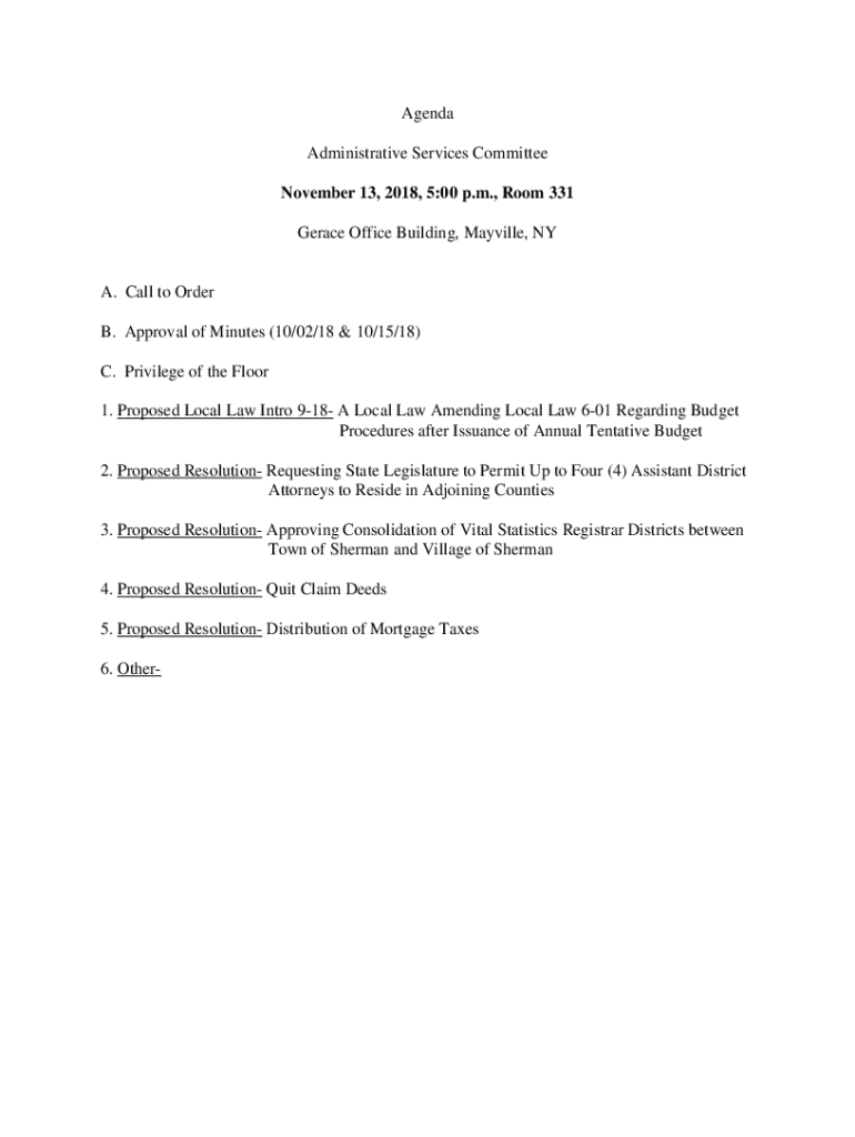 Agenda Administrative Services Committee November 13, 2018, 5:00 p.m., Room 331 Grace Office Building, Maryville, NYC. Call to Order B. Approval of Minutes (10/02/18 & 10/15/18) C. Privilege of the