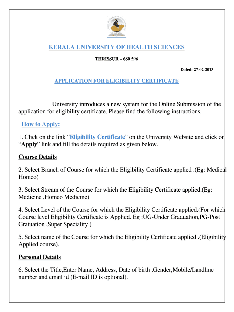 KERALA UNIVERSITY OF HEALTH SCIENCES TISSUE 680 596 Dated: 27022013APPLICATION FOR ELIGIBILITY CERTIFICATEUniversity introduces a new system for the Online Submission of the application for eligibility