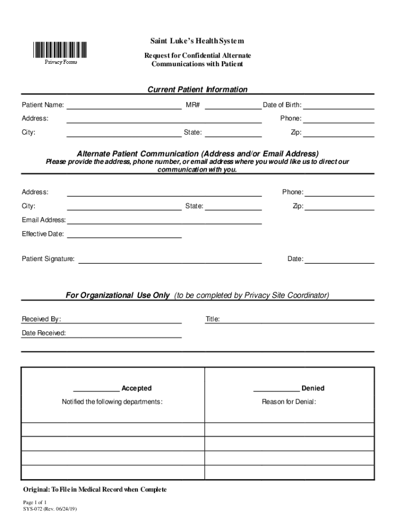 Saint Luke's Health System Request for Confidential Alternate Communications with PatientCurrent Patient Information Patient Name:MR#Date of Birth:Address:Phone:City:State:Zip:Alternate Patient Communication