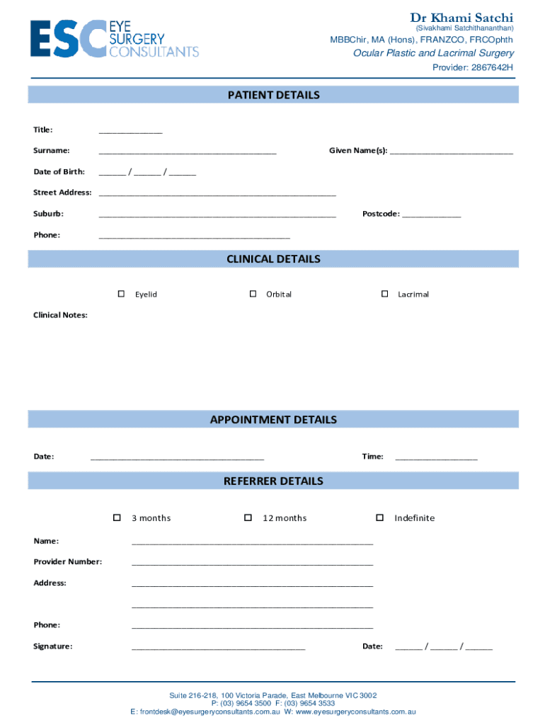 Dr Khaki Saatchi(Sivakhami Satchithananthan)Melchior, MA (Hons), FRANCO, FRCOphthOcular Plastic and Lacrimal Surgery Provider: 2867642HPATIENT DETAILS Title:___Surname:___Date of Birth:___ / ___ /
