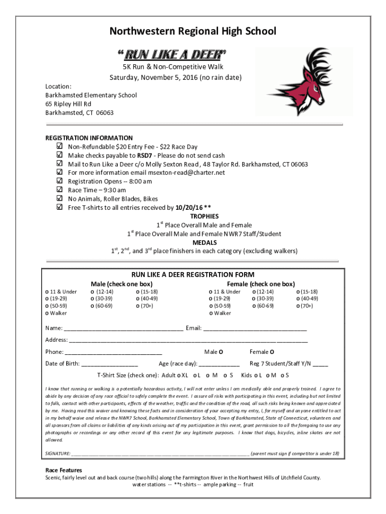 Northwestern Regional High School RUN LIKE A DEER 5K Run & Noncompetitive Walk Saturday, November 5, 2016 (no rain date) Location: Barkhamsted Elementary School 65 Ripley Hill Rd Barkhamsted, CT 06063REGISTRATION