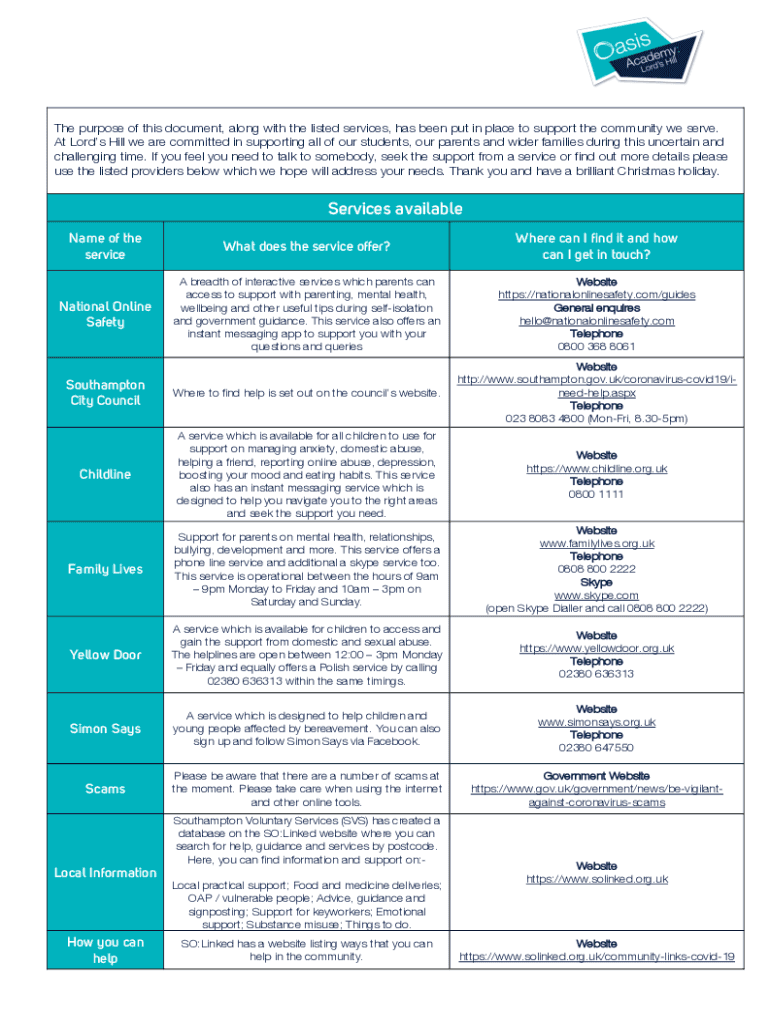 The purpose of this document, along with the listed services, has been put in place to support the community we serve. At Lords Hill we are committed in supporting all of our students, our parents