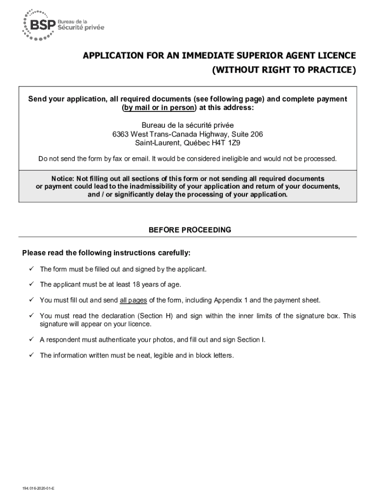 APPLICATION FOR AN IMMEDIATE SUPERIOR AGENT License (WITHOUT RIGHT TO PRACTICE) Send your application, all required documents (see following page) and complete payment (by mail or in person) at this