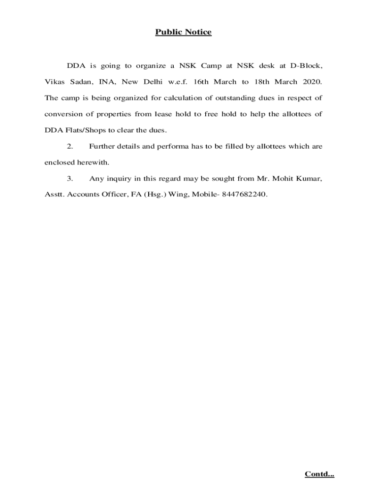 Public Notice DDA is going to organize an ASK Camp at ASK desk at Block, Vikas Sudan, INA, New Delhi w.e.f. 16th March to 18th March 2020. The camp is being organized for calculation of outstanding
