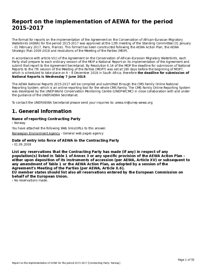 Report on the implementation of AEA for the period 20152017 The format for reports on the implementation of the Agreement on the Conservation of African Eurasian Migratory Waterbirds (AEA) for the