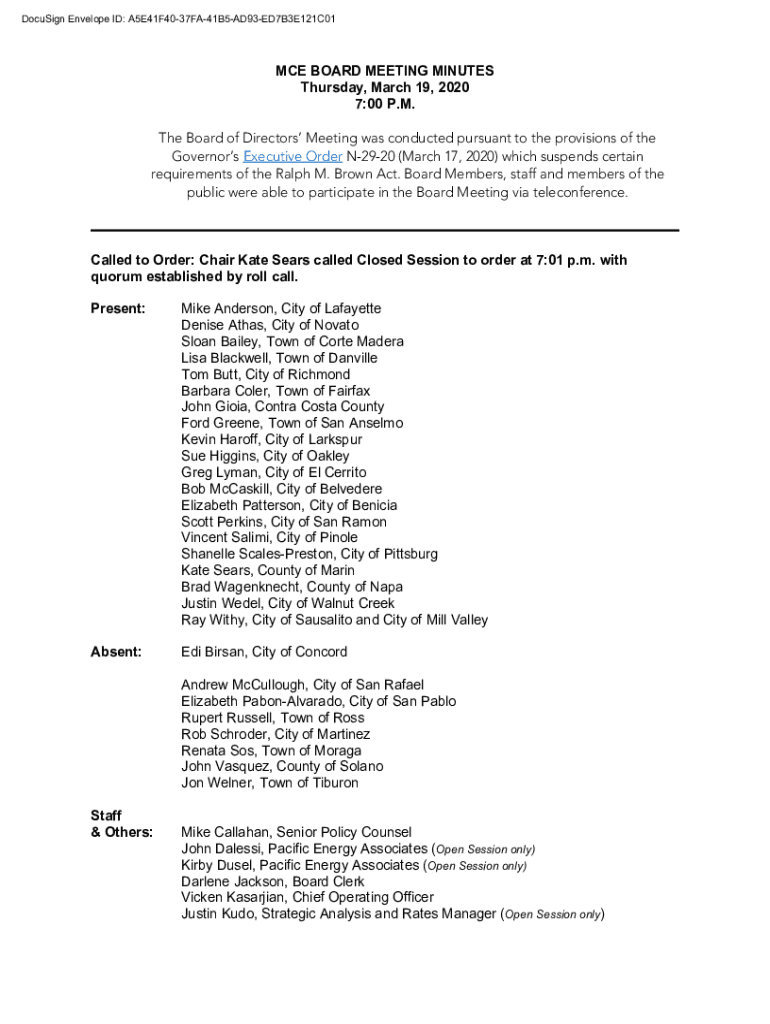 DocuSign Envelope ID: A5E41F4037FA41B5AD93ED7B3E121C01MCE BOARD MEETING MINUTES Thursday, March 19, 2020 7:00 P.M. The Board of Directors Meeting was conducted pursuant to the provisions of the Governors