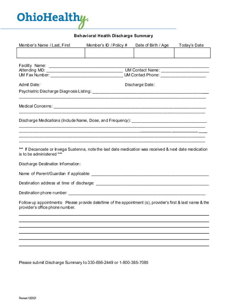 To fill out the behavioral health discharge summary, one should include patient identification information, treatment details, progress notes, discharge plans, follow-up care instructions, and any additional relevant observations necessary for future care.