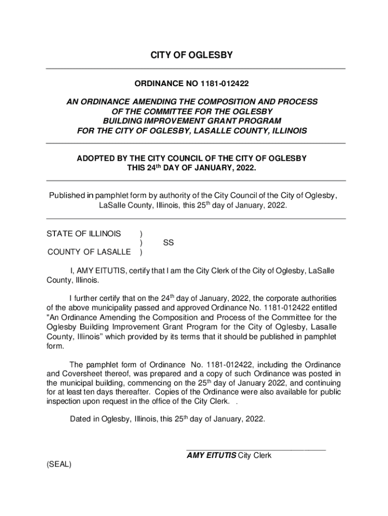 CITY OF OGLES ORDINANCE NO 1181012422 AN ORDINANCE AMENDING THE COMPOSITION AND PROCESS OF THE COMMITTEE FOR THE OGLES BUILDING IMPROVEMENT GRANT PROGRAM FOR THE CITY OF OGLES, BASALLY COUNTY, ILLINOISADOPTED