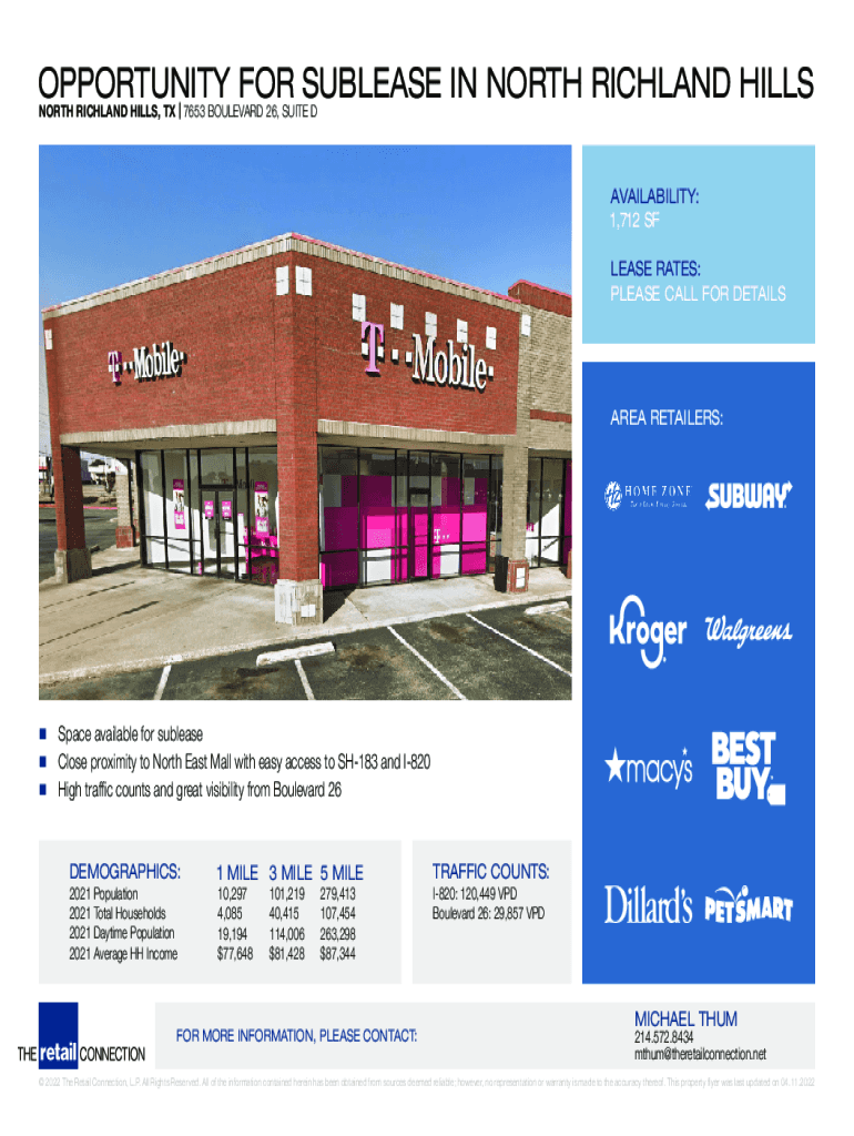 OPPORTUNITY FOR SUBLEASE IN NORTH RICHLAND HILLS NORTH RICHLAND HILLS, TX | 7653 BOULEVARD 26, SUITED AVAILABILITY: 1,712 SF LEASE RATES: PLEASE CALL FOR DETAILSAREA RETAILERS:Space available for