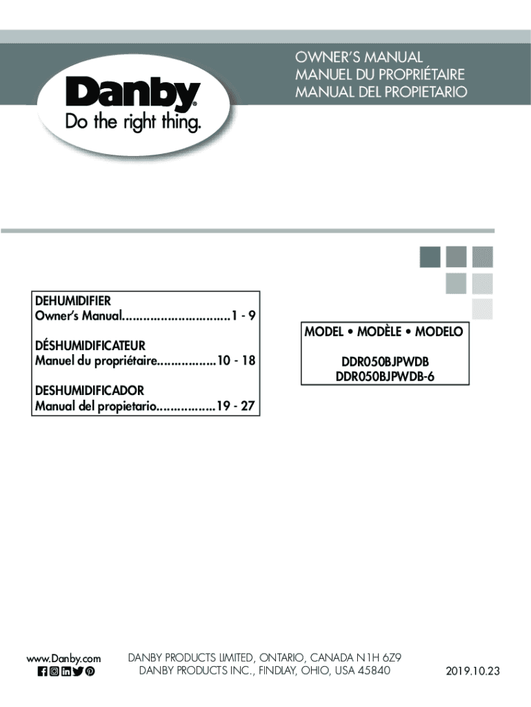 OWNERS MANUAL MANUEL DU PROPRIETARY MANUAL DEL PROPIETARIODEHUMIDIFIER Owners Manual...............................1 9 MODEL MODE MODEL DSHUMIDIFICATEUR Manuel Du proprietary.................10 18DDR050BJPWDB